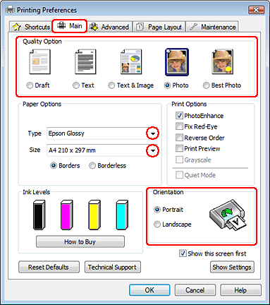 Cliquez sur l'onglet Main (Principal) et sélectionnez un des paramètres Quality Option (Option Qualité) suivants :