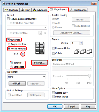 Cliquez sur l’onglet Page Layout (Disposition), sélectionnez Multi-Page (Multi-Pages), puis sélectionnez Poster Printing (Impression poster). Cliquez sur la flèche Haut ou Bas pour sélectionner 2x1, 2x2, 3x3 ou 4x4.