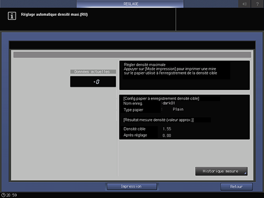 Le résultat du réglage automatique s'affiche dans Données actuelles. Cette valeur est appliquée à Réglage densité maximale.