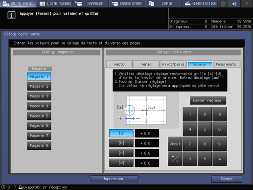 Entrez les données de réglage acquises par l'impression d'une mire et la mesure de l'écart entre le recto et le verso au point de mesure sur le verso.