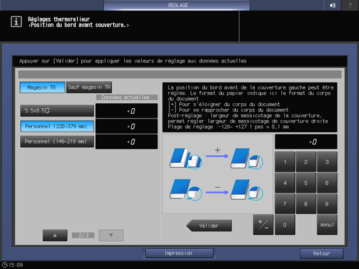 Exemple : rapprochez le bord avant du papier couverture gauche de 2 mm des pages de corps lorsque le format papier des pages de corps est défini sur Personnalisé (220~379 mm).