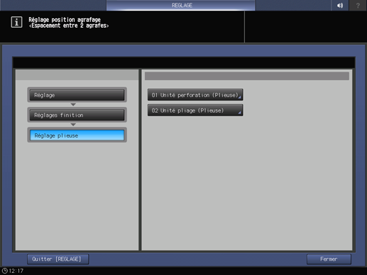 Appuyez sur Unité pliage (Plieuse) dans le menu Réglage plieuse.