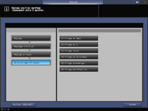 Appuyez sur Unité pliage (Plieuse) dans le menu Réglage plieuse.