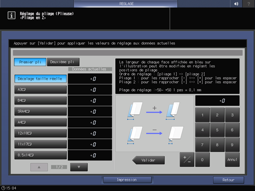 Sélectionnez Pliage 2 et utilisez le clavier de l'écran tactile pour entrer la valeur de réglage.