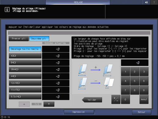 Sélectionnez Pliage 2 et utilisez le clavier de l'écran tactile pour entrer la valeur de réglage.