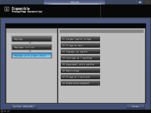Appuyez successivement sur Réglages finition, Réglage unité piqûre cheval et Butée lame massicot.