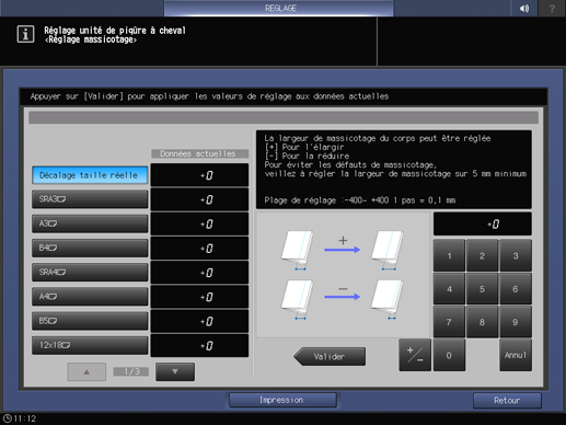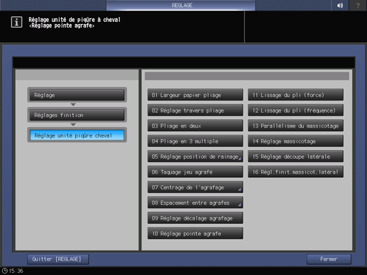 Appuyez successivement sur Réglages finition, Réglage unité piqûre cheval et Réglage massicotage.