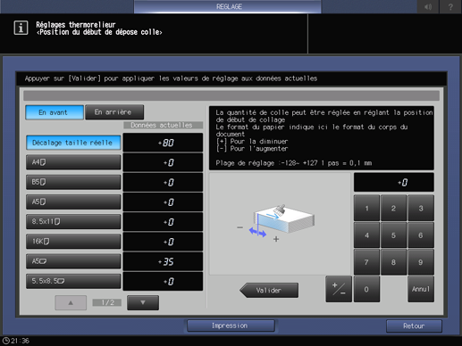 Réglez la position de début d'encollage des pages du corps et réglez la quantité de colle avec le thermorelieur PB-503. Les formats mentionnés dans cette section renvoient à ceux des corps correspondant aux formats couverture.
