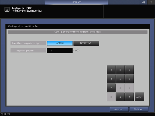 Si vous définissez Pré-élév. magasin orig. sur Activé, utilisez le pavé numérique de l'écran tactile ou les touches downup pour entrer la valeur de réglage du magasin papier.