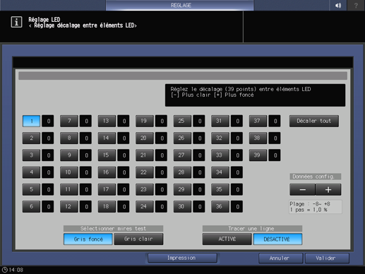 Sur l'écran Régl. décalage éléments LED, sélectionnez une des touches de points de 1 à 39 qui correspond au point de décalage identifié et appuyez sur + ou - pour entrer la valeur de configuration. Pour réaliser un réglage universel, sélectionnez Décaler tout et entrez la valeur de configuration.