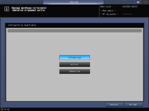 Appuyez consécutivement sur Réglages finition, Agrafeuse, Réglage agrafeuse (principale) et Opération alignement sortie.