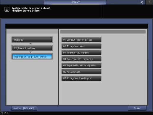 Appuyez successivement sur Réglages finition, Piqueuse à cheval et Centrage de l'agrafage.