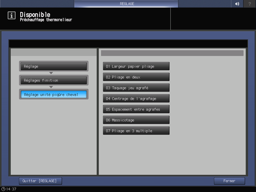 Appuyez successivement sur Réglages finition, Réglage unité piqûre cheval et Espacement entre agrafes.