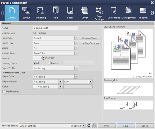 Impression de pages | Définit la plage de pages à imprimer. Vous pouvez spécifier jusqu'à 10 000 pages. Ce réglage n'est pas conservé même en cliquant sur Enregistrer. (La fermeture de l'écran Job Setting restaure le réglage d'origine). Vous ne pouvez l’activer que lors de l'impression de la tâche en appuyant sur Imprimer. |