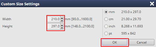 Spécifiez la Largeur et la Hauteur, sélectionnez l'unité souhaitée, puis cliquez sur OK.
