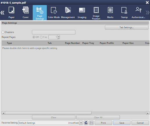 Les éléments de réglage sont ici les mêmes que ceux de l'écran Options page-spécifiques du pilote Plug-in PS à l'exception des Réglages onglet. Pour en savoir plus sur les éléments de configuration commune, voir Écran Par page.