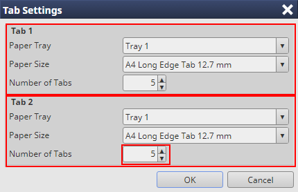 Pour Onglet 1 et Onglet 2, configurez Magasin, Format papier et Nombre d'onglets, puis cliquez sur OK.