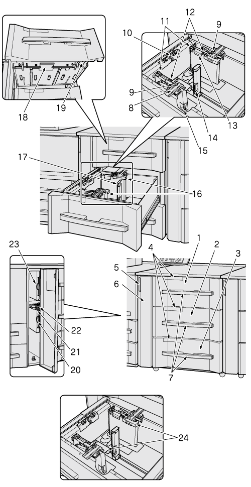 3 | Magasin supérieur (Magasin 5) (Magasin 8 pour la 2ème unité, Magasin 11 pour la 3ème unité) | Contient 1850 feuilles (80 g/m2 / 21 lb Bond). |