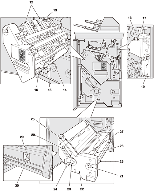 12 | Plaque de régulation horizontal | Ajuste la position transversale des feuilles imprimées à agrafer. |