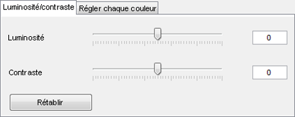 Rétablir | Abandonne les réglages actuels de l'onglet Luminosité/contraste et restaure les derniers réglages enregistrés. |