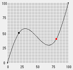 Le point 0 (point de début) et le point 100 (point final) ne bougent pas mais les points adjacents peuvent être déplacés à 1 % et 99 %. Lorsque vous déplacez le point ajouté adjacent au point final, vous pouvez définir la section adjacente des deux extrémités quasiment uniformément (valeur de sortie).