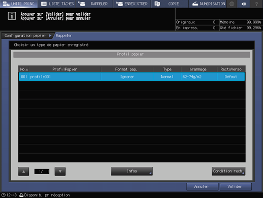 Sélectionnez un profil papier dont la marque (nom de profil papier), le Format papier, le Type de papier et le Grammage correspondent à ceux du papier à régler, puis appuyez sur OK.