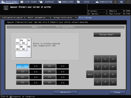 Réimprimez la mire de réglage du recto et vérifiez les longueurs aux points [2], [4], [6] et [8] de la seconde et troisième mires de test.