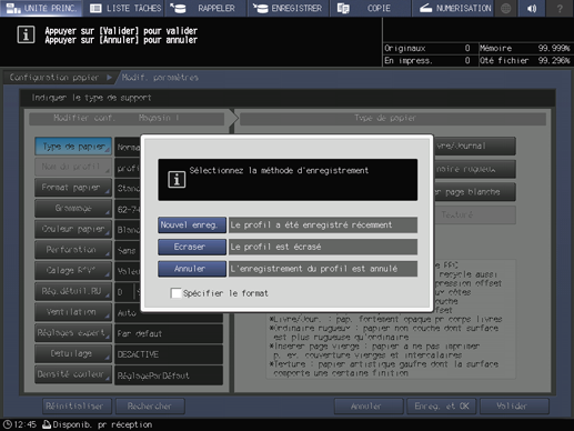 Si un réglage est effectué pour une nouvelle marque, un nouveau grammage ou format de papier, son contenu est nouvellement enregistré comme profil papier.