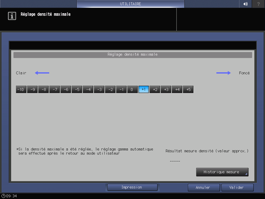 Le résultat de mesure de densité est affiché dans la partie inférieure droite de l'écran Réglage densité maximale.