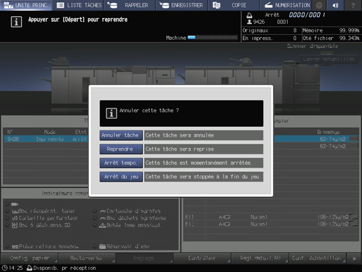 Explication supplémentaireAppuyez sur Arrêt tempo. pour suspendre la tâche. Dans ce cas, les originaux qui n'ont pas été encore numérisés sont laissés dans le magasin originaux de l'ADF. Appuyez sur Départ sur le panneau de commande pour reprendre la tâche.