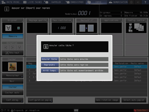 Explication supplémentaireAppuyez sur Arrêt tempo. pour suspendre la tâche. Quand la tâche est suspendue, certains réglages peuvent être modifiés. Appuyez sur Départ sur le panneau de commande pour reprendre la tâche.