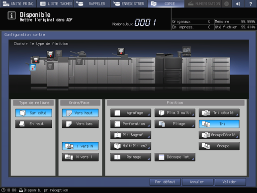 Explication supplémentaireSans la sélection de 2->2 ou 2->1 à l'étape 3, le message Le type de reliure est actif uniquement lors de numéris.réglage r-v d'original s'affiche dans la zone de message et le réglage En haut est inopérant.