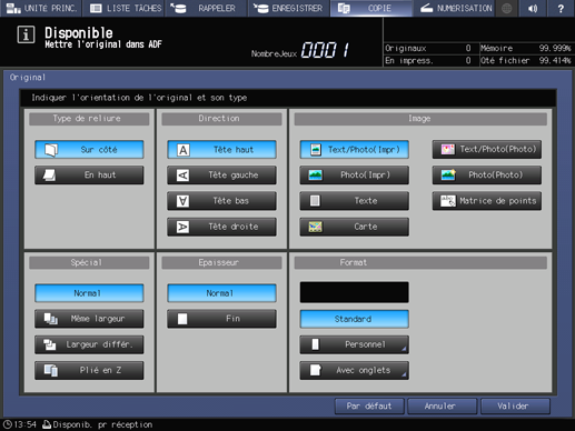 condition préalablePour copier la partie onglet, un réglage papier supplémentaire est nécessaire en plus du réglage Original. Spécifiez le magasin du papier à onglet dans Réglage papier. Pour des détails, voir Configurer le papier d'un magasin.