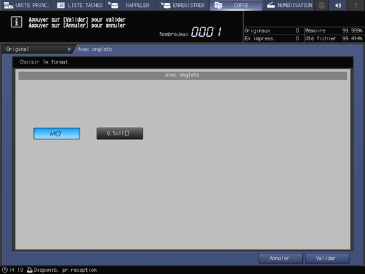 condition préalableLes formats d'originaux avec onglets acceptés sont uniquement A4Tlong edge feed / 8,5 11Tlong edge feed.
