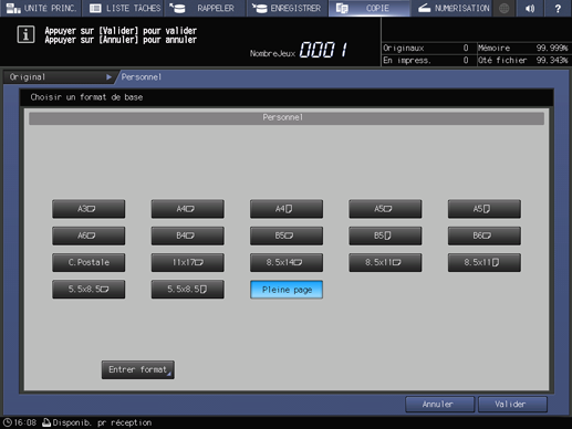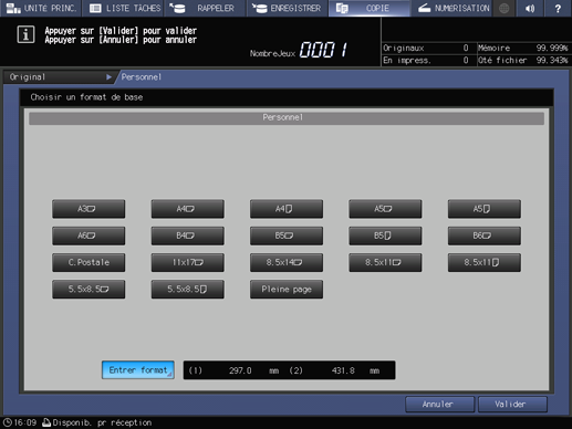 condition préalableVous pouvez enregistrer des formats personnalisés. Les informations de formats enregistrés peuvent être utilisés ultérieurement dans les réglages de format papier original et copie.