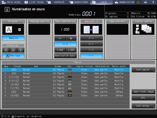 condition préalableEn mode Mémoire, le nombre de feuilles par tâches n'est pas limité. Il dépend de l'espace libre sur le disque dur. La machine peut numériser environ 10 000 feuilles de format A4.