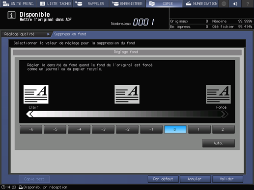 Explication supplémentaireL'écran COPIE réapparaît. L'indication Réglage fond se trouve sous l'onglet Réglage qualité de l'écran COPIE.