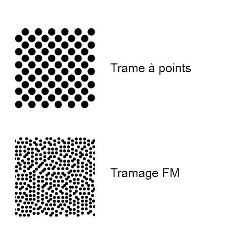 Le tramage FM (aléatoire) est une méthode de diffusion d'erreur qui utilise de petits points apériodiques pour reproduire les images. Cette méthode reproduit nettement les originaux de texte.