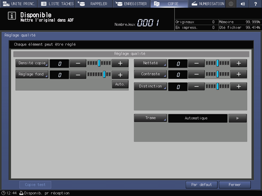 L'écran COPIE réapparaît. L'indication Trame se trouve sous l'onglet Réglage qualité de l'écran COPIE.