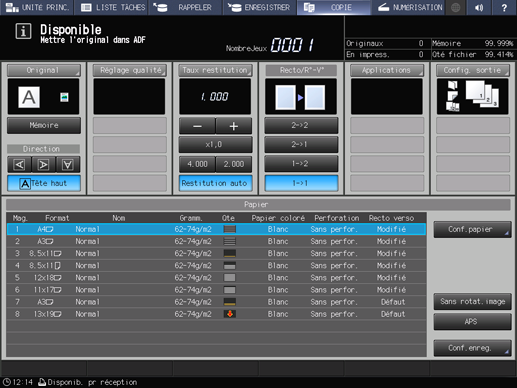 condition préalableRestitution auto est incompatible avec Sélect.auto.papier mais Rotation image est disponible.