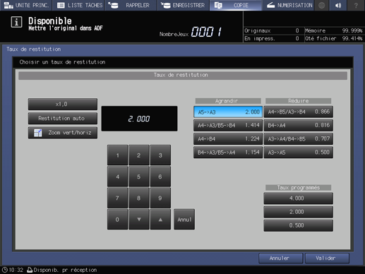Les réglages Agrandissement/Réduction (fixe) et Taux programmés s'effectuent sur l'écran UTILITAIRE. Pour des détails, voir Taux de restitution.