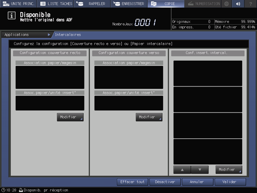 Couver. imprimée | Pour copier et joindre une couverture, appuyez sur Couv.copiée. Pour insérer des intercalaires vierges, appuyez sur Couv.blanche. |