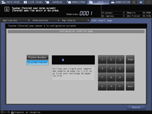 Explication supplémentaireEntrez le numéro de page d'insertion à l'aide du clavier à l'écran. Lorsque vous spécifiez plusieurs pages, délimitez-les avec une virgule (,). Lorsque vous spécifiez la plage, insérez un tiret (-) entre les numéros de page. Un maximum de 20 caractères peuvent être spécifiés, y compris un tiret de commande.