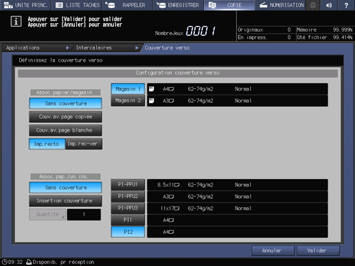 condition préalableLa couverture avant et arrière peut être introduite une feuille à la fois à partir du Magasin 1 au Magasin 11 et de PI-PFU1 à PI-PFU3 et/ou par paquet de 40 feuilles à partir de l'unité d'insertion. Lorsque des feuilles alimentent simultanément le magasin machine et l'unité d'insertion, l'unité d'insertion introduit la première couverture (recto) et la dernière couverture (verso).
