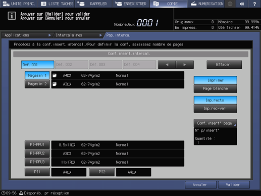 condition préalableJusqu'à 100 types d'intercalaire peuvent être spécifiés dans une plage comprise entre 1 et 999 pages séparément des couvertures recto et verso. De même, vous pouvez insérer un maximum de 40 feuilles à chaque point d'insertion de l'unité d'insertion.
