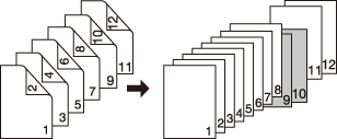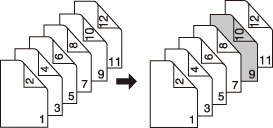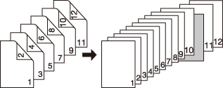2->1 | Une feuille vierge est insérée après la copie en recto de la 5e feuille (9e et 10e pages) d'un original recto-verso. Vous ne pouvez pas insérer de feuille après un numéro de page impair du jeu copié. ![]() |