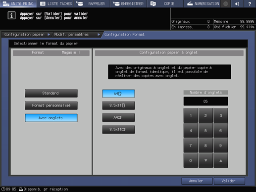 Pour entrer le nombre d'onglets, utilisez le pavé numérique de l'écran tactile, down, up ou le pavé numérique du panneau de contrôle. La plage de réglage pour le nombre d'onglets va de 1 à 15.