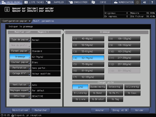 L'écran Grammage s'affiche. Sélectionnez une touche de grammage sous Grammage.