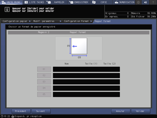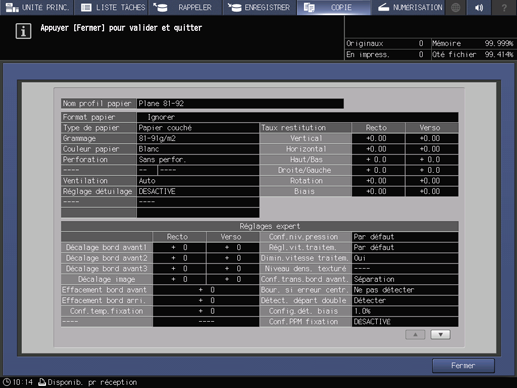 Explication supplémentaireL'écran affiche les éléments Format, Nom, Gramm., Qte, Papier coloré, Perforation et Calage recto-verso pour la configuration papier de chaque magasin. Le Nom indique normalement un type de papier ou un nom de profil en cas de rappel de spécifications enregistrées.
