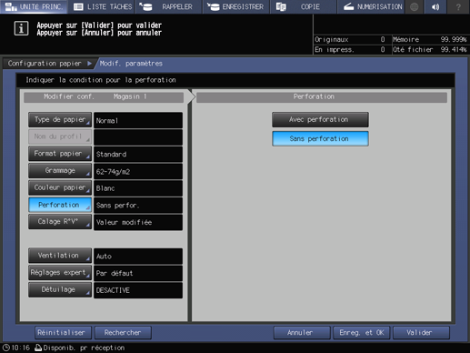 Pour charger des feuilles perforées, sélectionnez Avec perforation et pour charger des feuilles sans perforation, sélectionnez Sans perforation.